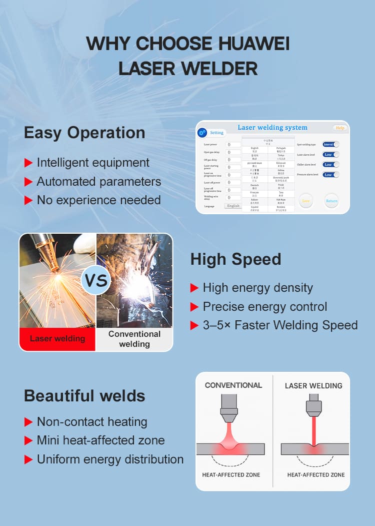 ఈ HUAWEI LASER 1500W 2000W 3000W డ్యూరబుల్ 4 in1 లేజర్ వెల్డింగ్ మెషిన్ అధిక-నాణ్యత మెటల్ వెల్డింగ్ కోసం కొనుగోలుదారులకు ఖచ్చితమైన, సమర్థవంతమైన మరియు సులభంగా ఆపరేట్ చేయగల పరిష్కారాన్ని అందిస్తుంది. స్టెయిన్లెస్ స్టీల్, కార్బన్ స్టీల్ మరియు అల్యూమినియంపై చక్కటి పని కోసం రూపొందించబడింది, ఇది మృదువైన అతుకులు, లోతైన వ్యాప్తి మరియు కనిష్ట ఉష్ణ వక్రీకరణను అందిస్తుంది. దీని తేలికైన హ్యాండ్హెల్డ్ గన్ ఇరుకైన ప్రదేశాలలో సౌకర్యవంతమైన ఆపరేషన్కు మద్దతు ఇస్తుంది, ఇది వర్క్షాప్లు, ఆన్-సైట్ ఫాబ్రికేషన్ మరియు రిపేర్ పనులకు అనువైనదిగా చేస్తుంది. స్థిరమైన అవుట్పుట్ మరియు తక్కువ నిర్వహణ అవసరాలతో, ఇది వివిధ లోహపు పని అవసరాలకు నమ్మకమైన రోజువారీ పనితీరును అందిస్తుంది.