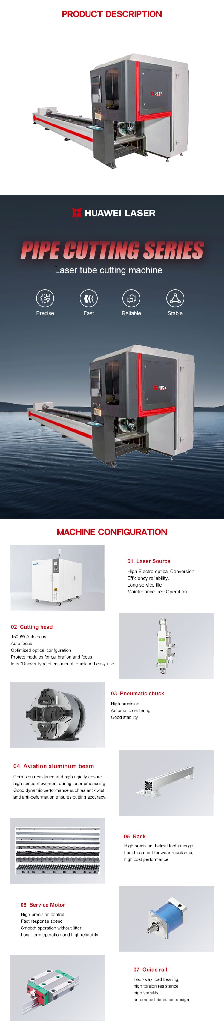 HUAWEI LASER 6000W హై-ప్రెసిషన్ డబుల్-చక్స్ ట్యూబ్ ఫైబర్ లేజర్ కట్టింగ్ మెషిన్ రౌండ్, స్క్వేర్ మరియు క్రమరహిత మెటల్ ట్యూబ్ల సమర్థవంతమైన మరియు ఖచ్చితమైన ప్రాసెసింగ్ కోసం రూపొందించబడింది. దీని ద్వంద్వ-చక్ వ్యవస్థ స్థిరమైన బిగింపు, కనిష్ట కంపనం మరియు హై-స్పీడ్ కట్టింగ్ సమయంలో ఖచ్చితమైన భ్రమణాన్ని నిర్ధారిస్తుంది. అధిక-పనితీరు గల ఫైబర్ లేజర్ మూలం మరియు ఇంటెలిజెంట్ కంట్రోల్ సాఫ్ట్వేర్తో అమర్చబడి, ఇది క్లీన్ కట్లు, మృదువైన అంచులు మరియు అద్భుతమైన పునరావృతతను అందిస్తుంది. HUAWEI లేజర్ డబుల్-చక్స్ ట్యూబ్ ఫైబర్ లేజర్ కట్టింగ్ మెషిన్ అనేది హై-ఎఫిషియన్సీ ట్యూబ్ మరియు పైప్ ప్రాసెసింగ్ కోసం ప్రత్యేకంగా రూపొందించబడిన అధునాతన హ్యాండ్హెల్డ్ లేజర్ వెల్డింగ్ మెషిన్ ప్రత్యామ్నాయం. డ్యూయల్ న్యూమాటిక్ చక్స్తో అమర్చబడి, ఇది గుండ్రని, చతురస్రం మరియు క్రమరహిత మెటల్ ట్యూబ్లపై మృదువైన, ఖచ్చితమైన కట్ల కోసం స్థిరమైన బిగింపు, స్వయంచాలక కేంద్రీకరణ మరియు ఖచ్చితమైన భ్రమణాన్ని నిర్ధారిస్తుంది. దీని హై-పవర్ ఫైబర్ లేజర్ మూలం వేగవంతమైన కట్టింగ్ స్పీడ్, క్లీన్ ఎడ్జ్లు మరియు కనిష్ట థర్మల్ డిఫార్మేషన్ను అందిస్తుంది. మెటల్ ఫాబ్రికేషన్, ఫర్నిచర్ తయారీ, ఫిట్నెస్ పరికరాల ఉత్పత్తి మరియు ఆటోమోటివ్ కాంపోనెంట్ల కోసం రూపొందించబడిన HUAWEI లేజర్ ట్యూబ్ కటింగ్ సిస్టమ్ ఆధునిక పారిశ్రామిక అనువర్తనాల కోసం అత్యుత్తమ ఖచ్చితత్వం, విశ్వసనీయత మరియు ఉత్పాదకతను అందిస్తుంది. ఇది ట్యూబ్-ప్రాసెసింగ్ అప్లికేషన్లకు బలమైన విశ్వసనీయత మరియు స్థిరమైన ఉత్పాదకతను అందిస్తుంది.